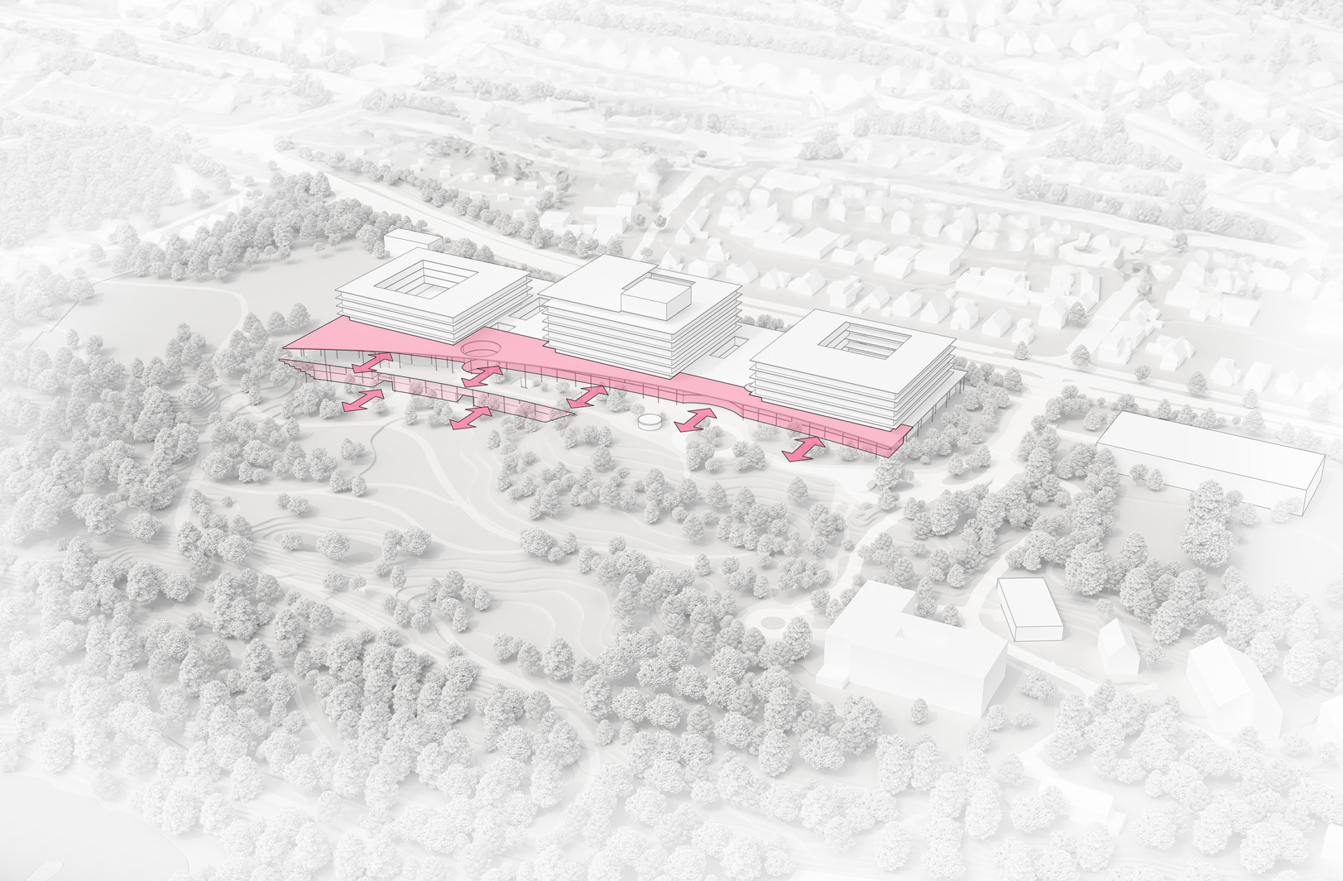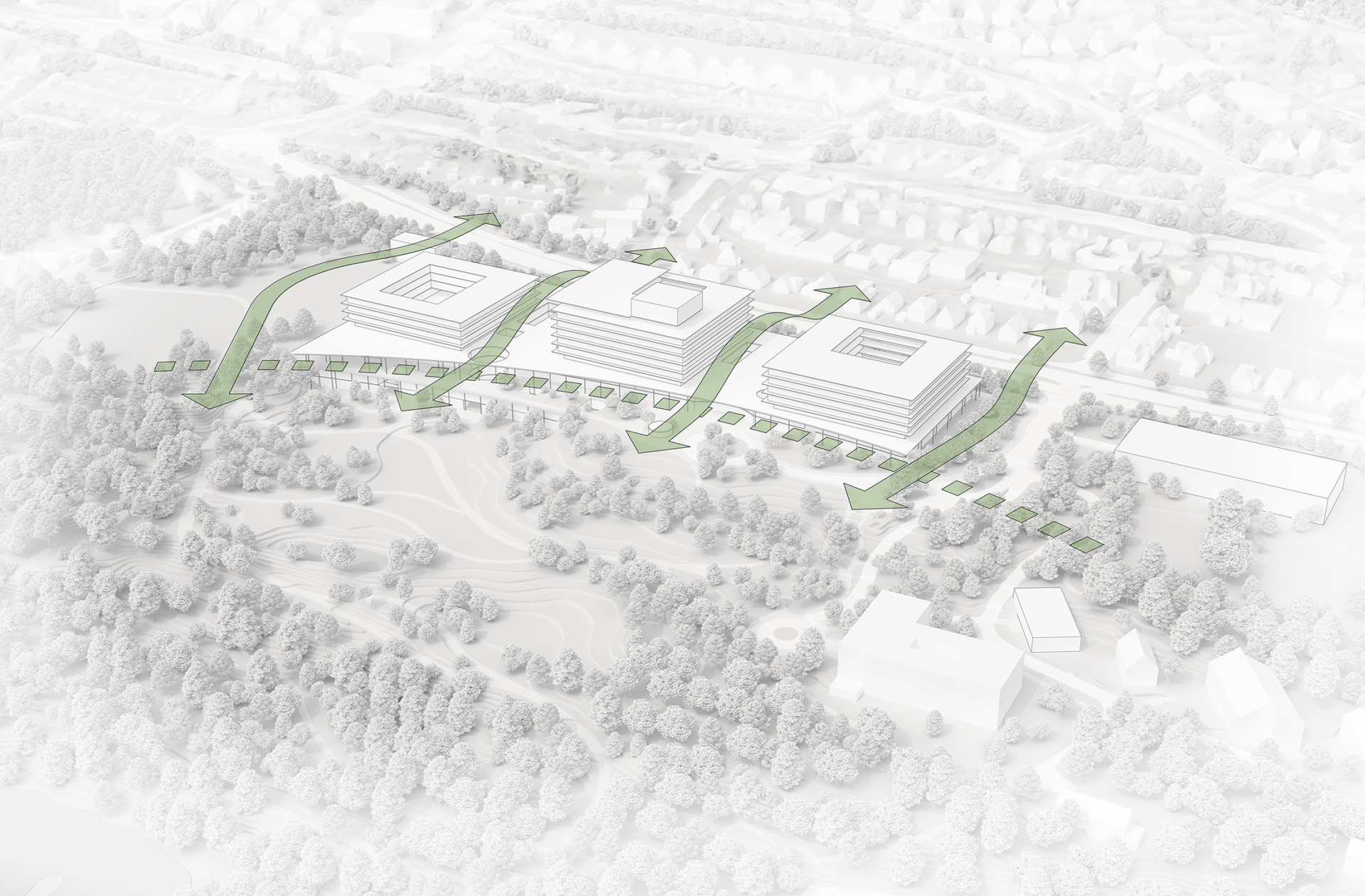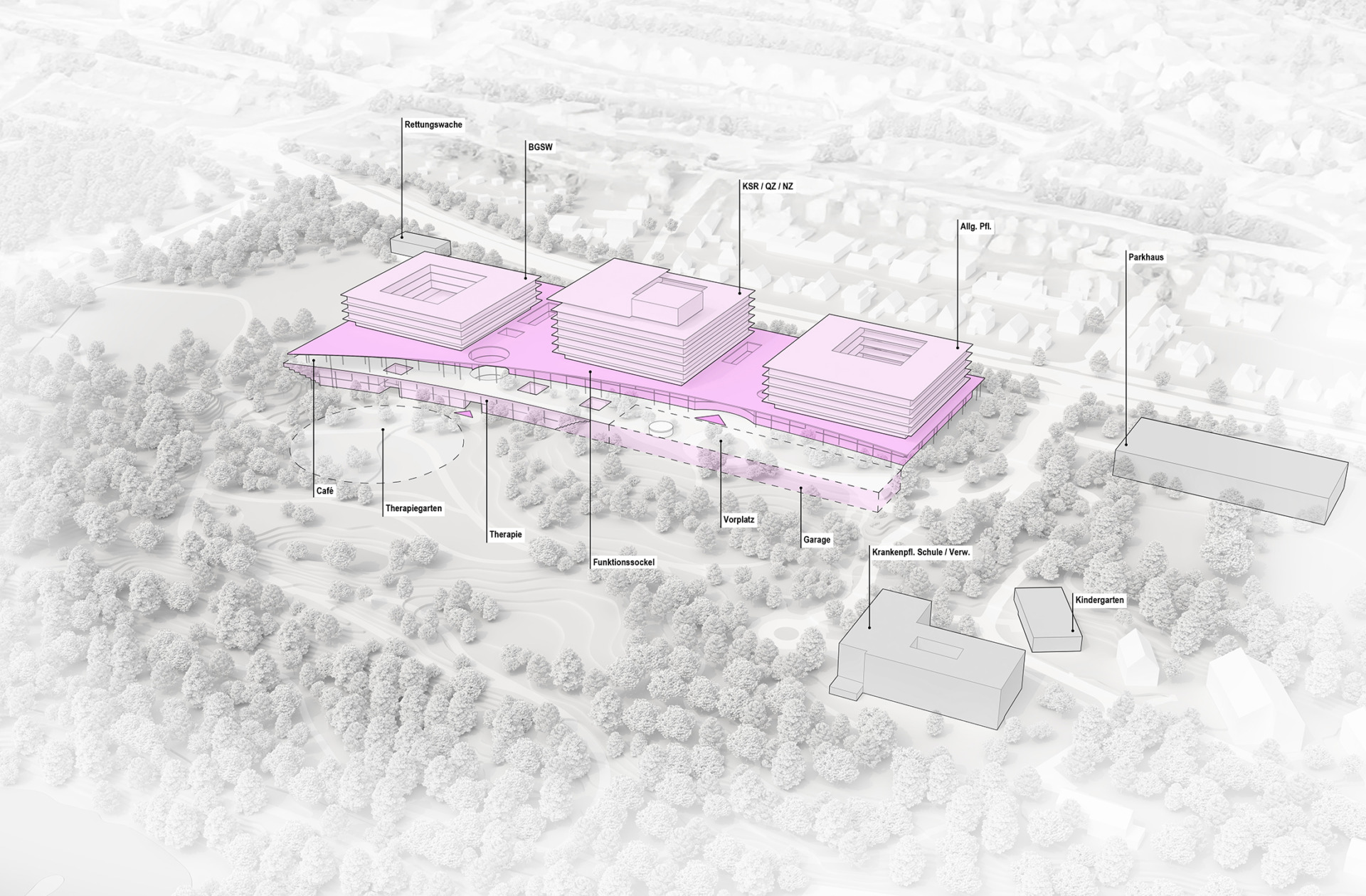 Die weithin sichtbare städtebauliche Figur des Neubaus wird durch die drei höhengestaffelten, lichten Pflegepavillons, die auf einem begrünten Sockel platziert werden, definiert. Die gewählte Typologie der großen Pavillons für die Pflege schafft im Gegensatz zur in den vorliegenden Machbarkeitsstudien angewendeten Kammstruktur eine große Durchlässigkeit zwischen der Nord- und der Südseite des Geländes und vermeidet die Bildung eines langen undurchlässigen Riegels. In der Fernwirkung entstehen Durchblicke. Die wichtige Frischluftzirkulation entlang der Hangkante bleibt erhalten. Der zweigeschossige Sockel, gegenüber dem die Pflegepavillons an allen Seiten deutlich zurückspringen, wirkt als niederschwelliger Vermittler zur Umgebung.