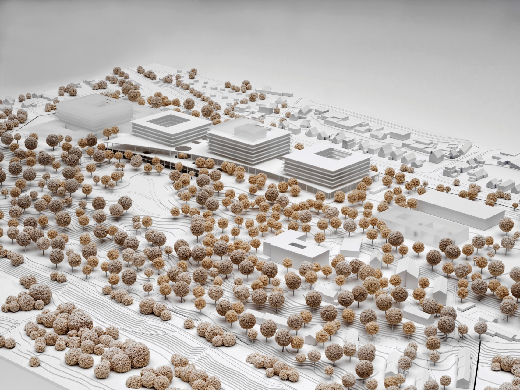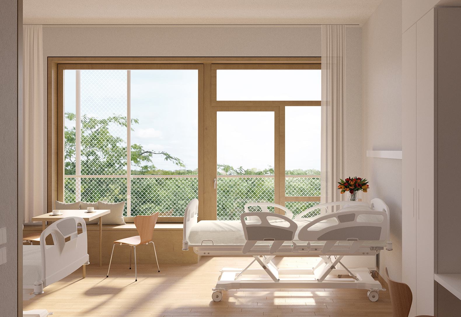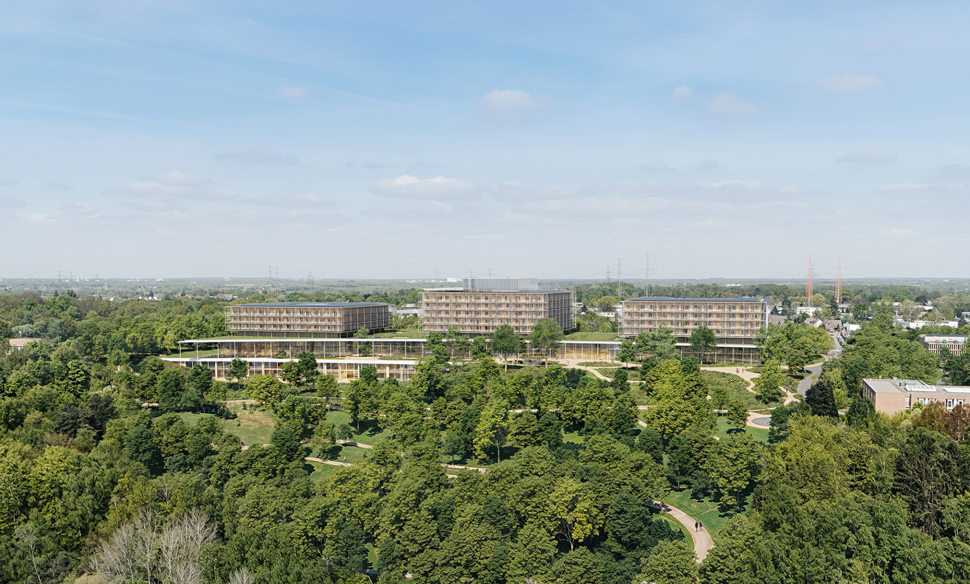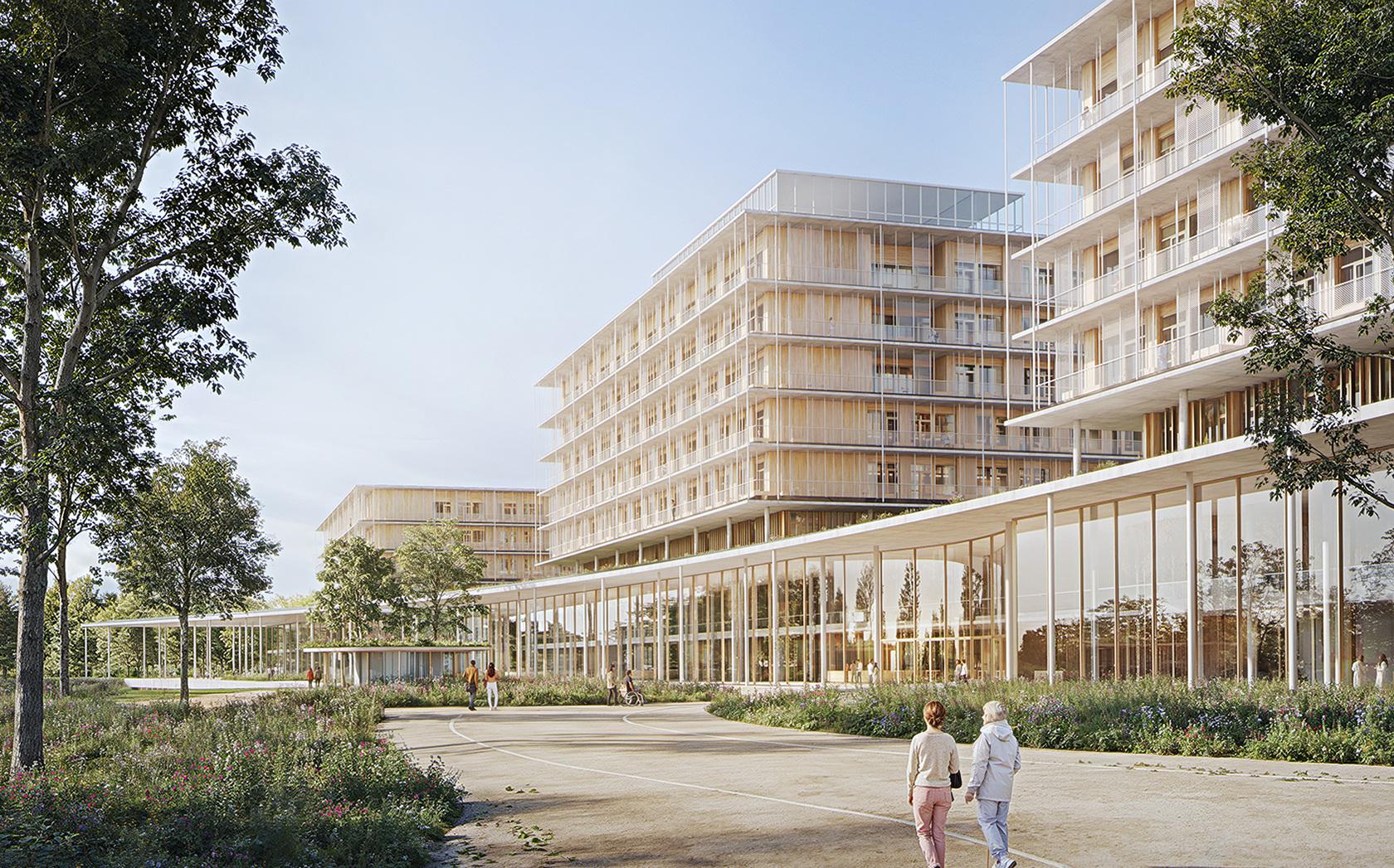 Die weithin sichtbare städtebauliche Figur des Neubaus wird durch die drei höhengestaffelten, lichten Pflegepavillons, die auf einem begrünten Sockel platziert werden, definiert. Die gewählte Typologie der großen Pavillons für die Pflege schafft im Gegensatz zur in den vorliegenden Machbarkeitsstudien angewendeten Kammstruktur eine große Durchlässigkeit zwischen der Nord- und der Südseite des Geländes und vermeidet die Bildung eines langen undurchlässigen Riegels. In der Fernwirkung entstehen Durchblicke. Die wichtige Frischluftzirkulation entlang der Hangkante bleibt erhalten. Der zweigeschossige Sockel, gegenüber dem die Pflegepavillons an allen Seiten deutlich zurückspringen, wirkt als niederschwelliger Vermittler zur Umgebung.