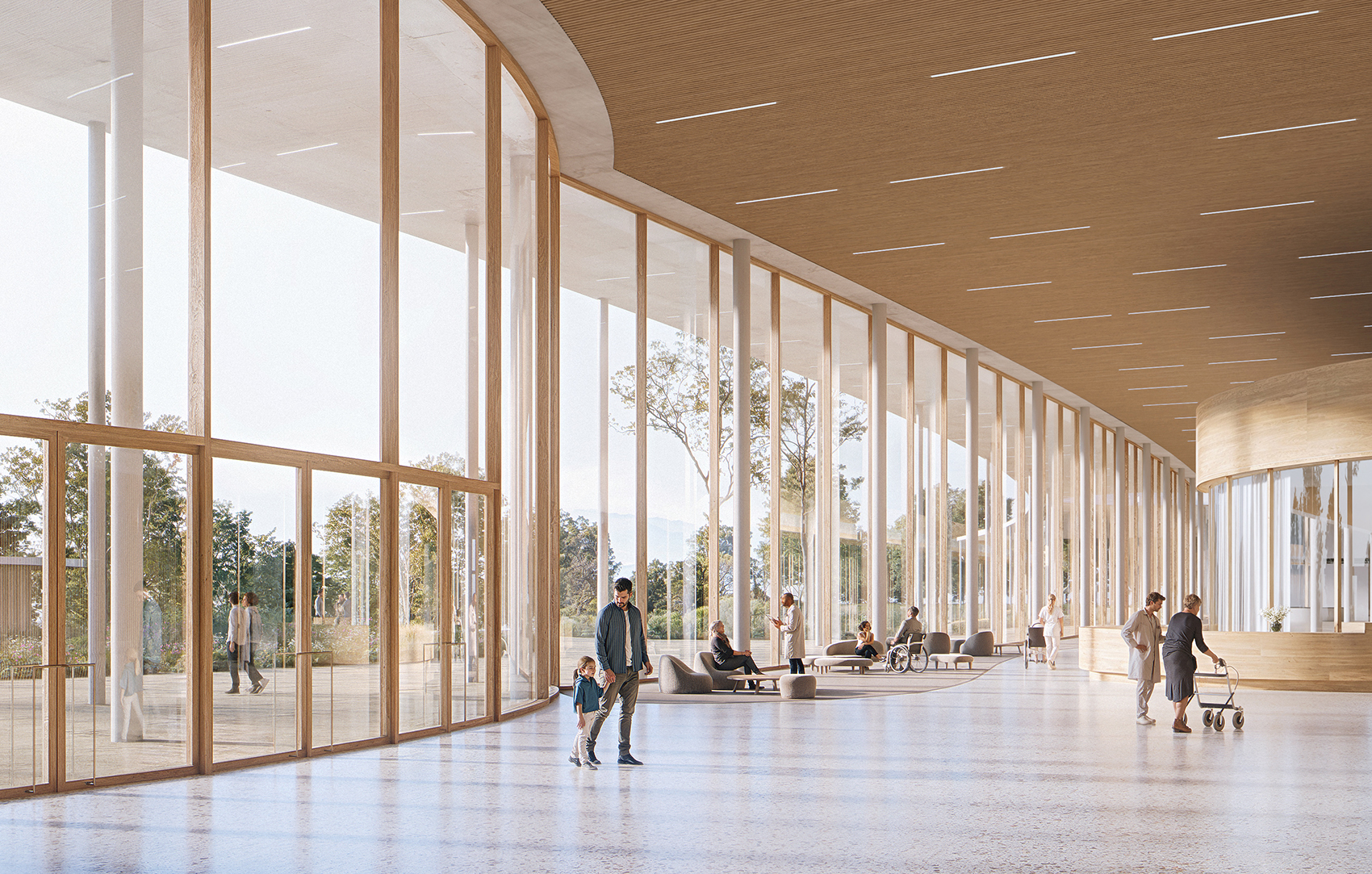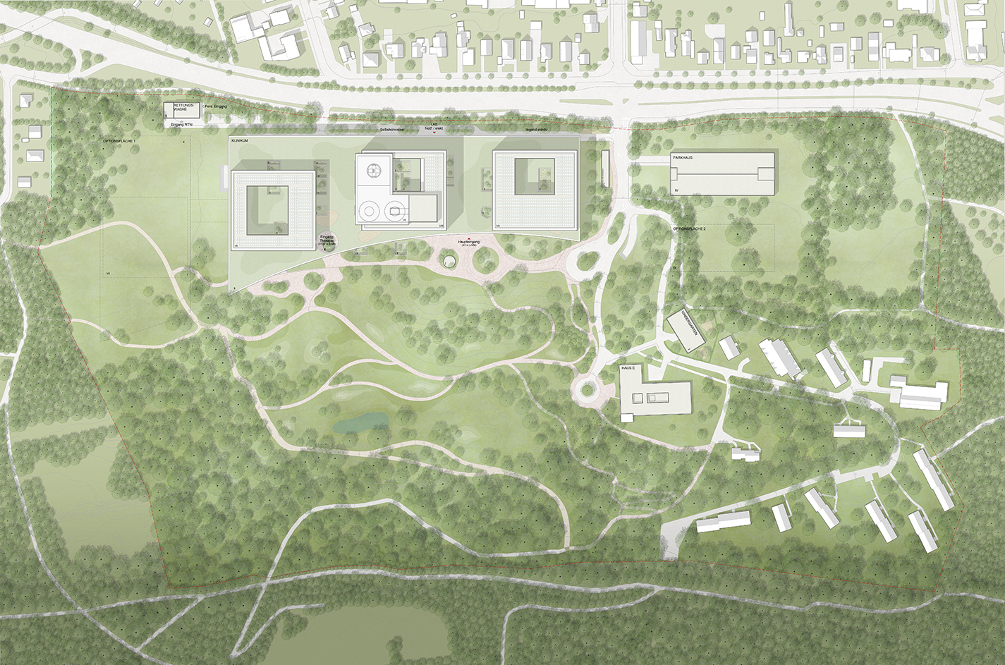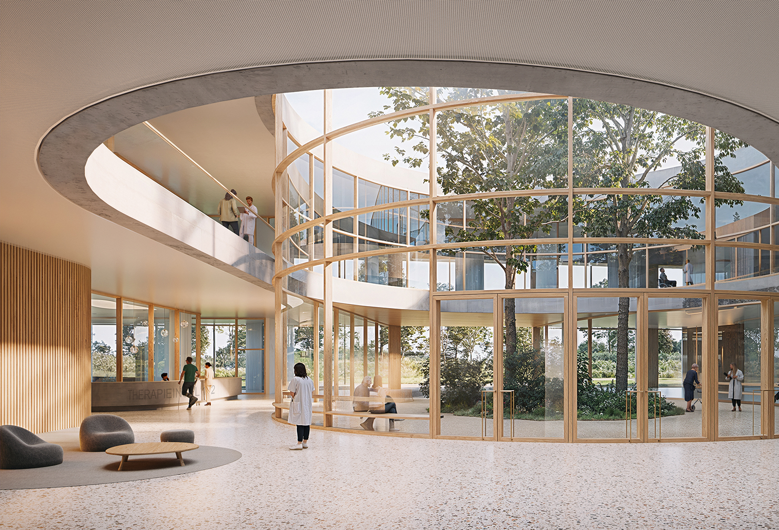 Die Lage am Geesthang, der großzügige, sich weitläufig hangabwärts nach Süden erstreckende Naturraum und der weite Blick über die Baumkronen hinweg nach Süden ins Elbe-Urstromtal führen zur entwurfsbestimmenden Entscheidung den Klinikvorplatz und den Haupteingang abweichend von den Machbarkeitsstudien nicht nach Osten, sondern nach Süden zu orientieren. Der Naturraum wird durch die konsequente Orientierung nach Süden und die Transparenz der gesamten südlichen Gebäudekante eng mit dem Gebäude verknüpft, erlebbar und wahrnehmbar gemacht. Ein großes, die natürliche Hangkante im oberen Bereich des Geländes aufnehmendes Kreissegment definiert die Kontur der südlichen Gebäudekante des Neubaus präzise und erzeugt eine große Geste, die das Gebäude über die gesamte Südseite zum angrenzenden Naturraum öffnet, diesen einbezieht und wie eine große Umarmung der Natur wirkt. Der große Schatz, der sich aus der einzigartigen natürlichen Umgebung ergibt, wird im Sinne einer heilenden, den Naturraum einbeziehenden Architektur, konsequent im Sinne der Patienten – aber auch der Mitarbeiter und Besucher – erlebbar.