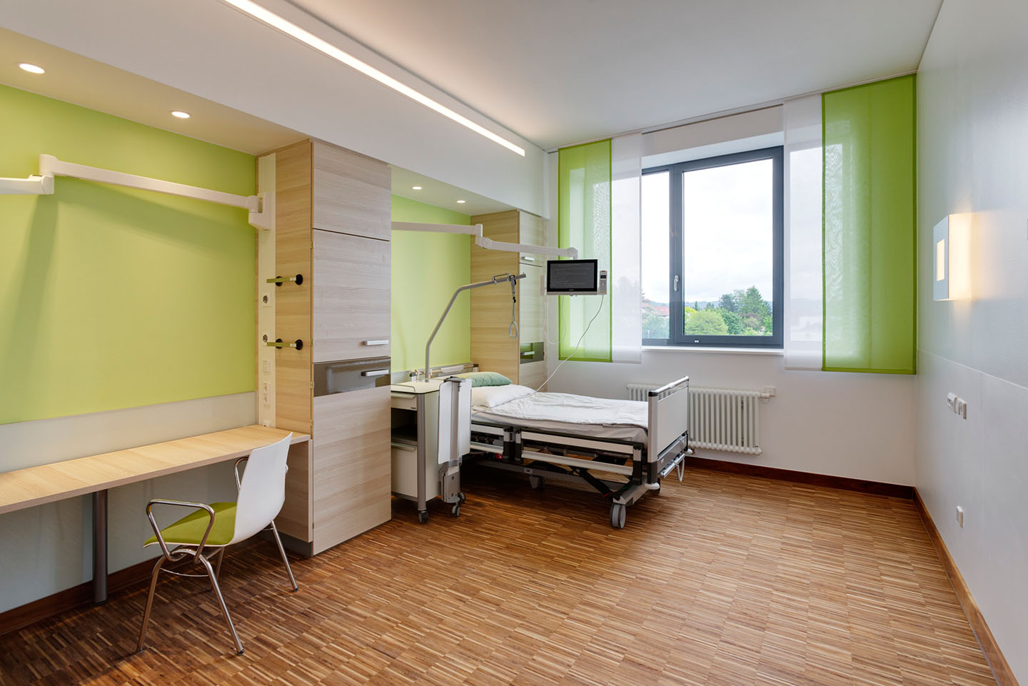 In einem ersten Bauabschnitt, der sich in unmittelbarer Nähe zum Bestand befindet, werden die zentralen Funktionen des Klinikums realisiert. In der kompakten nahezu quadratischen Grundrissstruktur gruppieren sich die Funktionen um einen zentral liegenden mehrgeschossigen Innenhof. Neben dem Hauptteil der Pflegebetten sowie dem OP-Bereich und der Intensivmedizin werden hier weitere Funktionsbereiche wie Notaufnahme, Ambulanzen, Radiologie, Labor und Großküche untergebracht. Mit dem Neubau entsteht eine vernetze Klinikstruktur mit workfloworientierten Funktionsbereichen, optimierten Wegen und moderner Technik. Vielfältige Ausblicke in die umgebende Landschaft und eine weitgehend natürliche Belichtung erhöhen nicht nur die Qualität der Arbeitsplätze sondern auch die Attraktivität der Patientenbereiche.